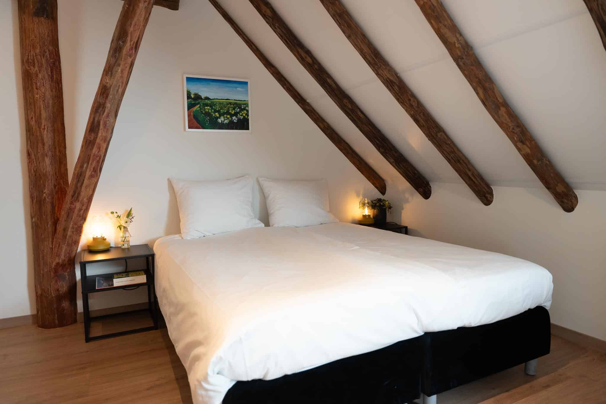 Deze kamer bevindt zich op de eerste etage van de boerderij en heeft naast een royaal queensize boxspringbed nog een eenpersoonsbed en stapelbed. Daarnaast kunnen we op verzoek een babybedje plaatsen.